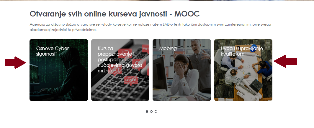 Da biste pristupili online kursevima na edukacijskom portalu potrebno je da sa početne strane odaberete željeni kurs (prikazano na slici ispod).