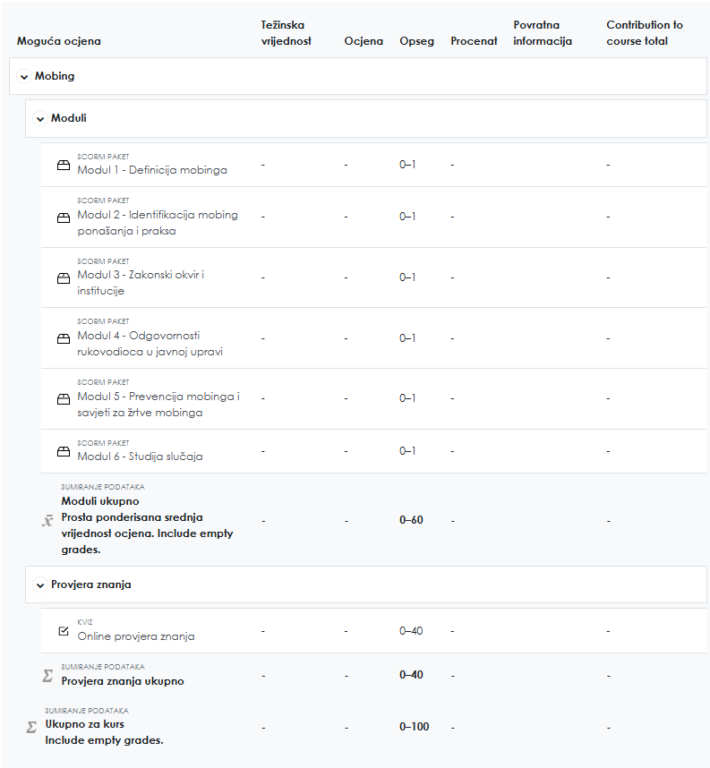 Otvoriće Vam se ekran kao na slici ispod. Možete pregledati Vaše ocjene na kursu, odnosno procenat ukupno ostvarenog broja bodova.